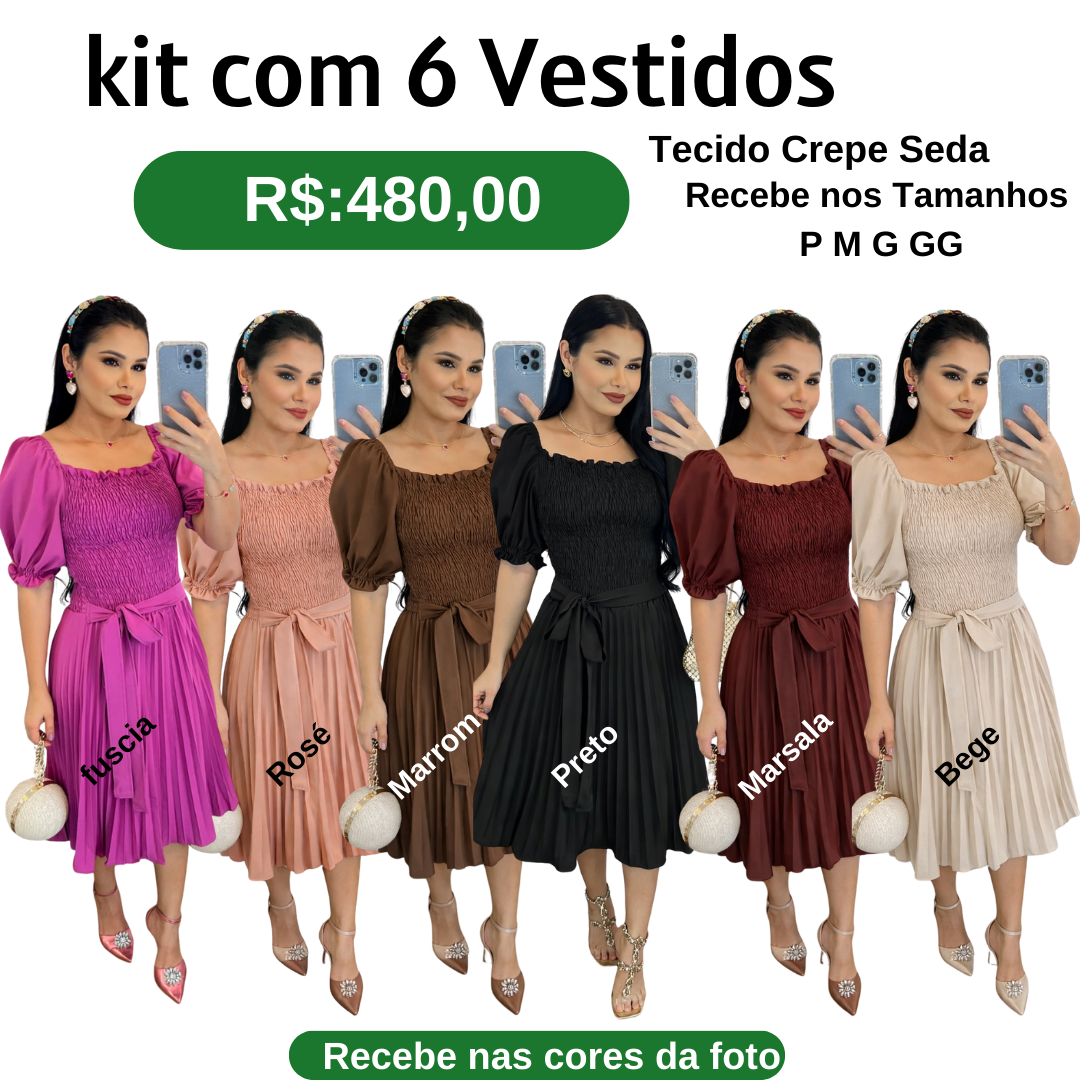 kit com 6 Vestido Plissados Midi-Tecido Crepe Seda