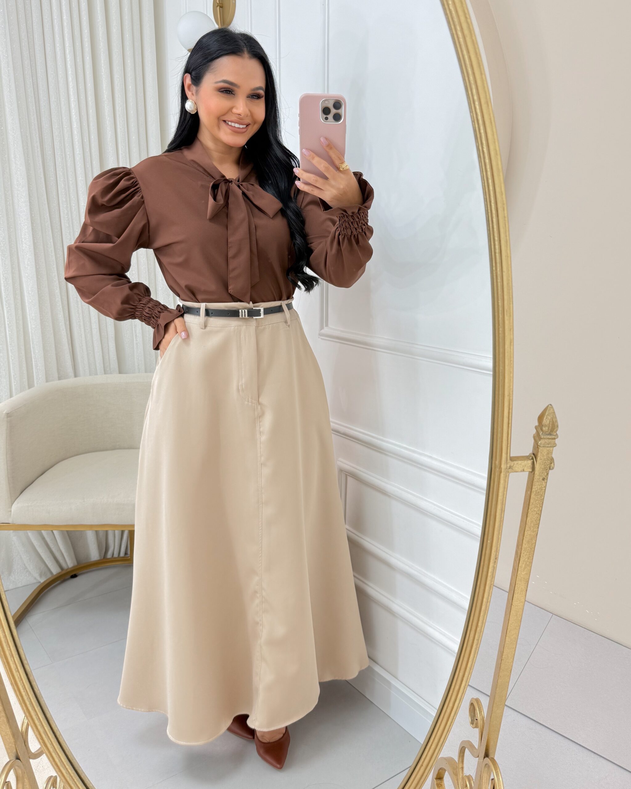 Versátil e elegante, a Saia Longa com cinto em tecido de Alfaiataria é uma escolha versátil para mulheres que valorizam o estilo e o conforto em igual medida.