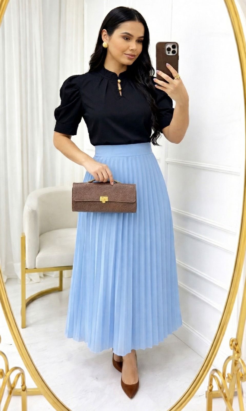 Sofisticação e estilo em uma única produção! Esta saia plissada em alfaiataria , garantindo um visual moderno, elegante e confortável. A modelagem alonga a silhueta e o plissado proporciona movimento leve e fluido.