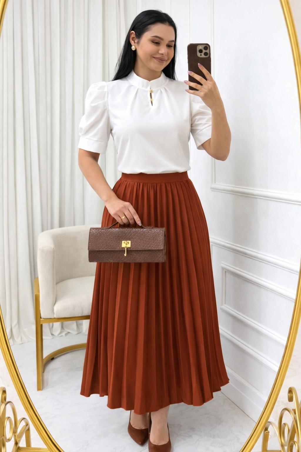 Saia Plissada em Alfaiataria caramelo