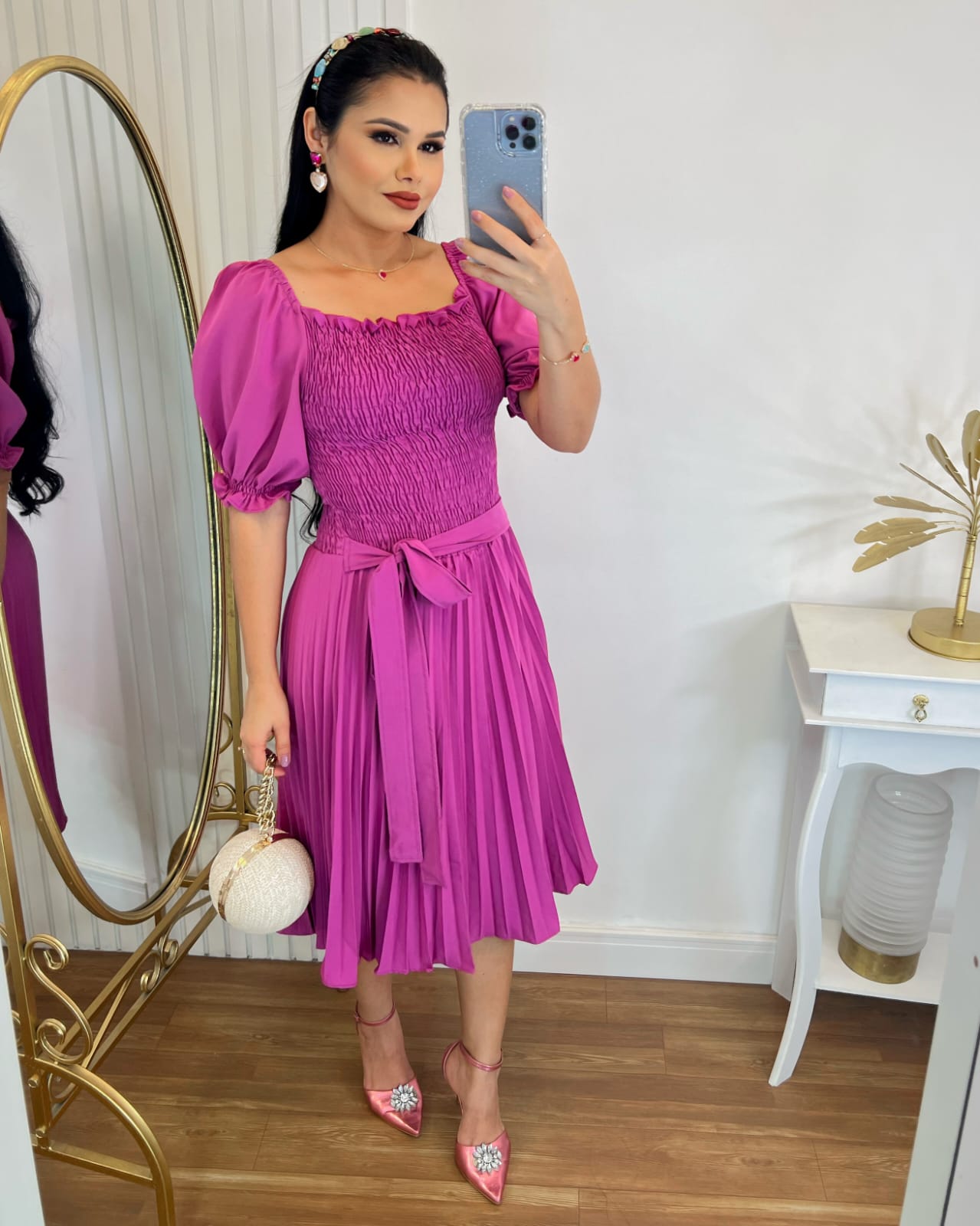 O vestido Plissado Midi é uma peça elegante e feminina que apresenta uma saia plissada com comprimento até os joelhos. O plissado é um tipo de pregueado que cria um efeito de textura na saia, adicionando dimensão e movimento ao vestido. Esse tipo de vestido é conhecido por sua versatilidade, pois pode ser usado em várias ocasiões, desde eventos formais até eventos mais descontraídos.